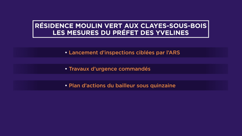 Suite à la diffusion du reportage, le préfet des Yvelines Frédéric Rose a pris plusieurs mesures d’urgence. Il a mandaté l’Agence régionale de santé pour évaluer l’état d’insalubrité des logements. Il a exigé que l’Immobilière du Moulin Vert engage des travaux d’urgence et présente un plan d’actions détaillé sous quinze jours.